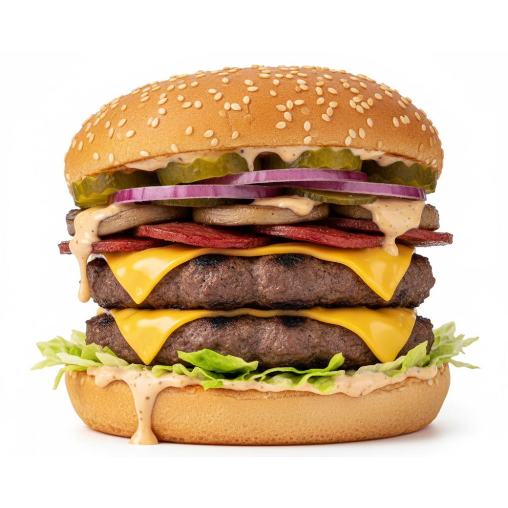 2BEEF PATTIES, TURISH SUJUK, MUSHROOM, ONION, PICKLE, CHEDDAR CHEESE, YUMMY SAUCE, LETTUCE